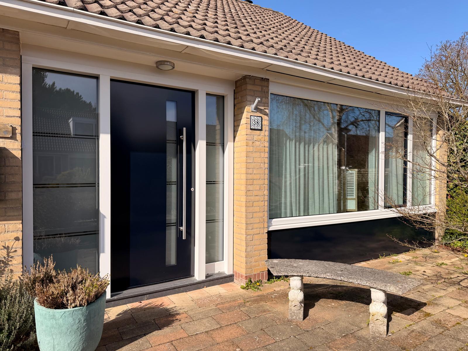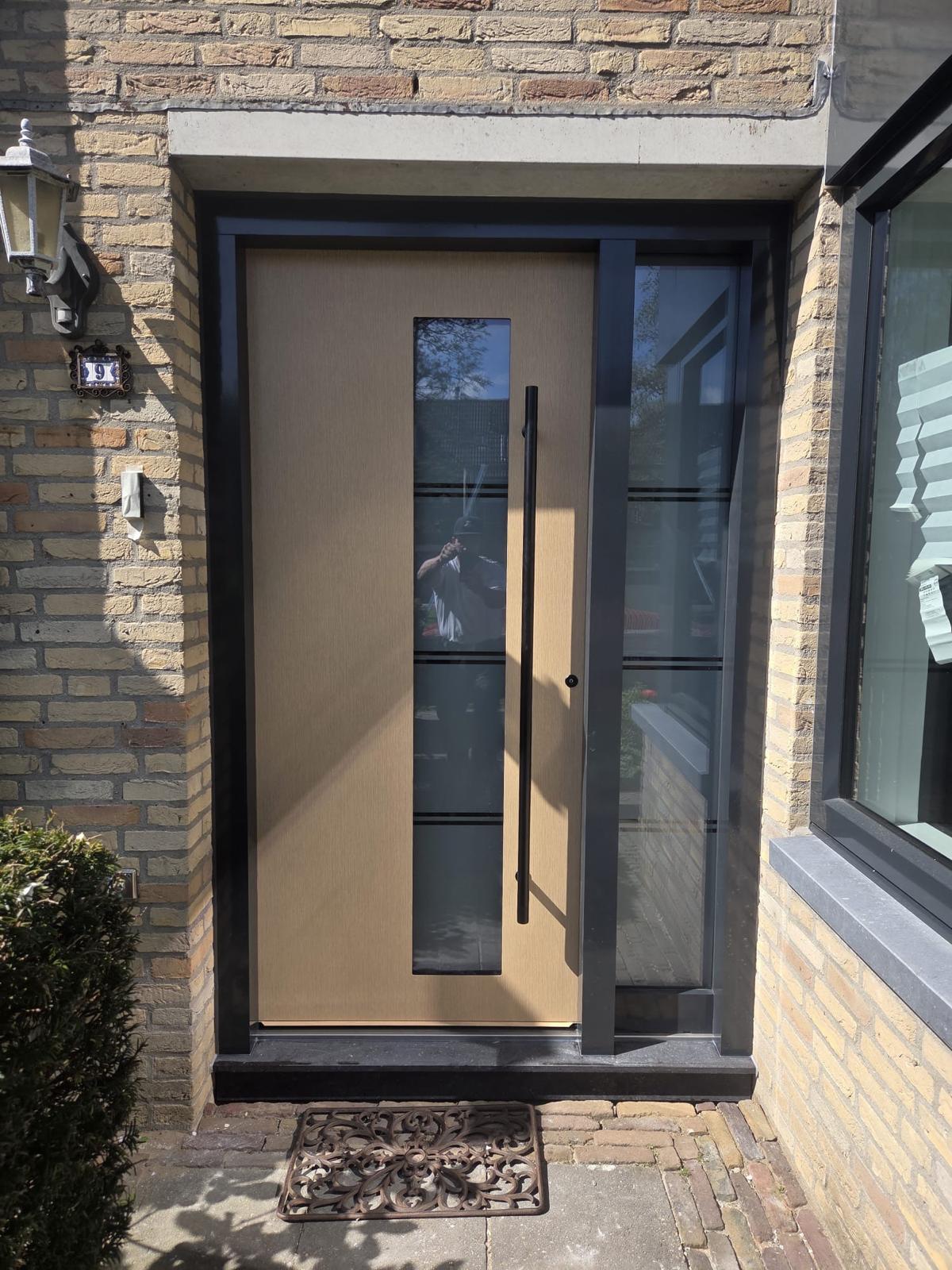 Strakke moderne voordeur geïnstalleerd door Knipping, perfect voor renovatie en nieuwbouwprojecten.